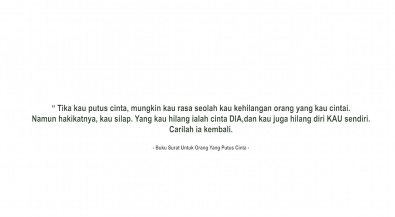 BIOGRAPHY GENERAL FICTION PARENTING ENGLISH NOVEL ANIMALS MOTIVATION. 1 Kau putus cinta dengan manusia. Tetapi untuk mendapat cinta Allah kau hanya berkorban ala kadar Kami dapat ribuan mesej anak muda hari ni sikit-sikit bermasalah tentang cinta.